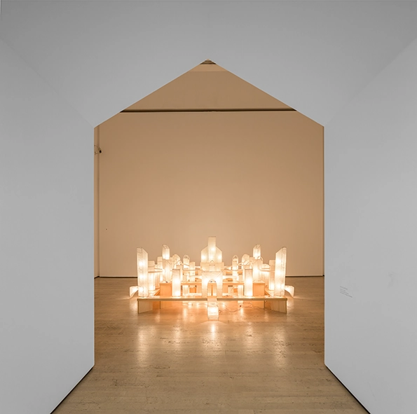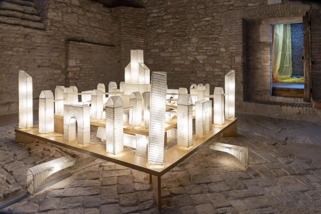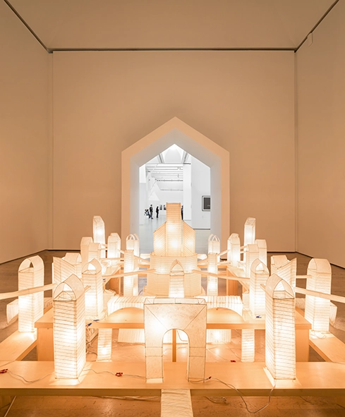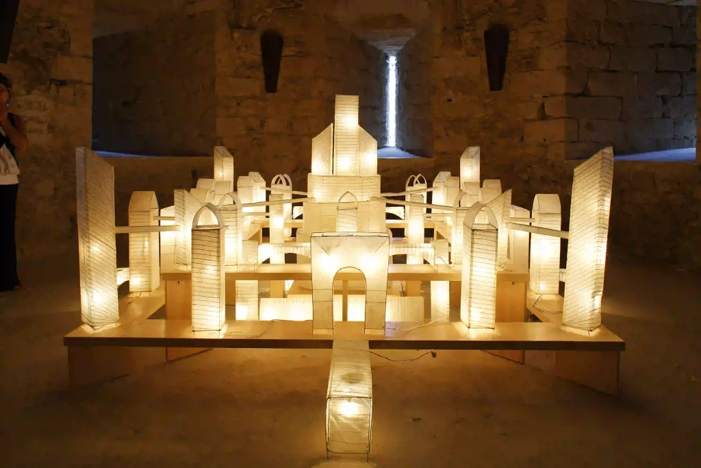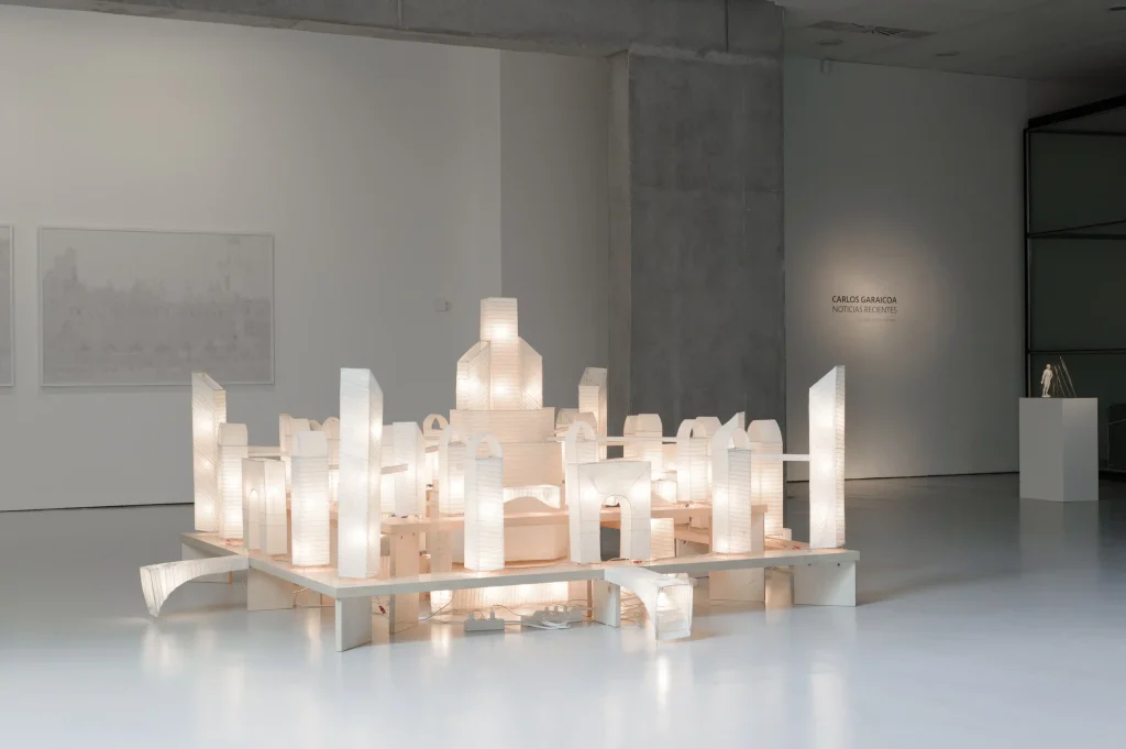 No Way Out forma parte de la serie “Nuevas Arquitecturas”. Se centra en la creación de una “ciudad ideal”, o una ciudad imaginada, que al mismo tiempo propone la configuración de un espacio más introspectivo – de meditación y distanciamiento de la realidad- manteniendo una relación “documental” con el espacio urbano. La instalación constituye un modelo de ciudad donde los edificios y su planificación urbanística se presentan en papel de arroz japonés aligerado y lámparas de alambre. La ciudad no es identificable y guarda una relación ambigua entre la noción de objeto y el modelado tradicional de la ciudad. (Carlos Garaicoa)