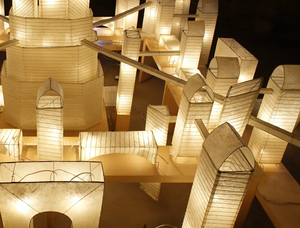 Instalación. Mesa de madera, lámparas de alambre y papel de arroz, luz.